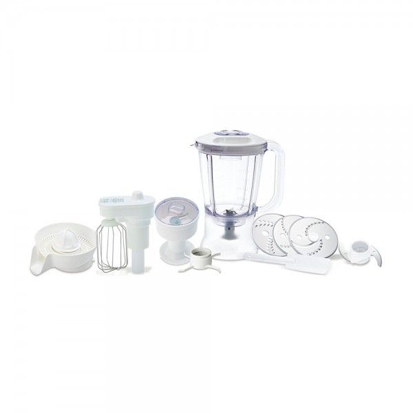 Robot multifunções com uma potência de 1000 W; Volume da taça grande 3 litros; Capacidade útil de 1 kg de massa pesada e 1,2 kg de massa leve; equipada com 2 discos de metal para ralar e cortar, de uma lâmina multifunções para: picar, misturar. Para o completar, está equipado com um liquidificador de 1,5 l, espremedor de citrinos e uma mini-picadora.